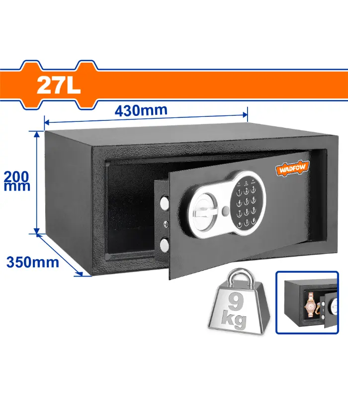 Вклучува: 1 x сеф, 2 x механички клучеви, 1 x упатство за корисникот/упатства за монтажа, 4 x експанзиони болтови